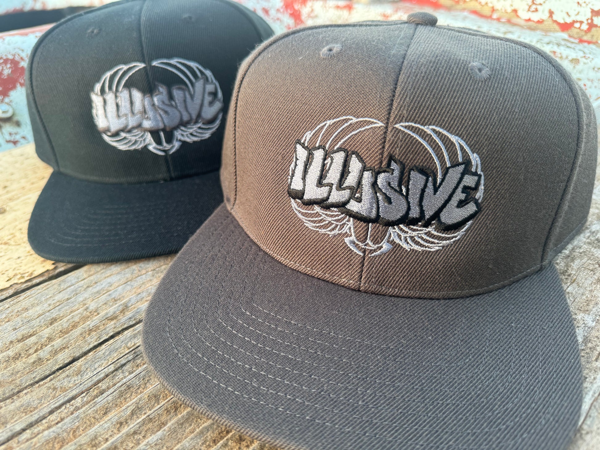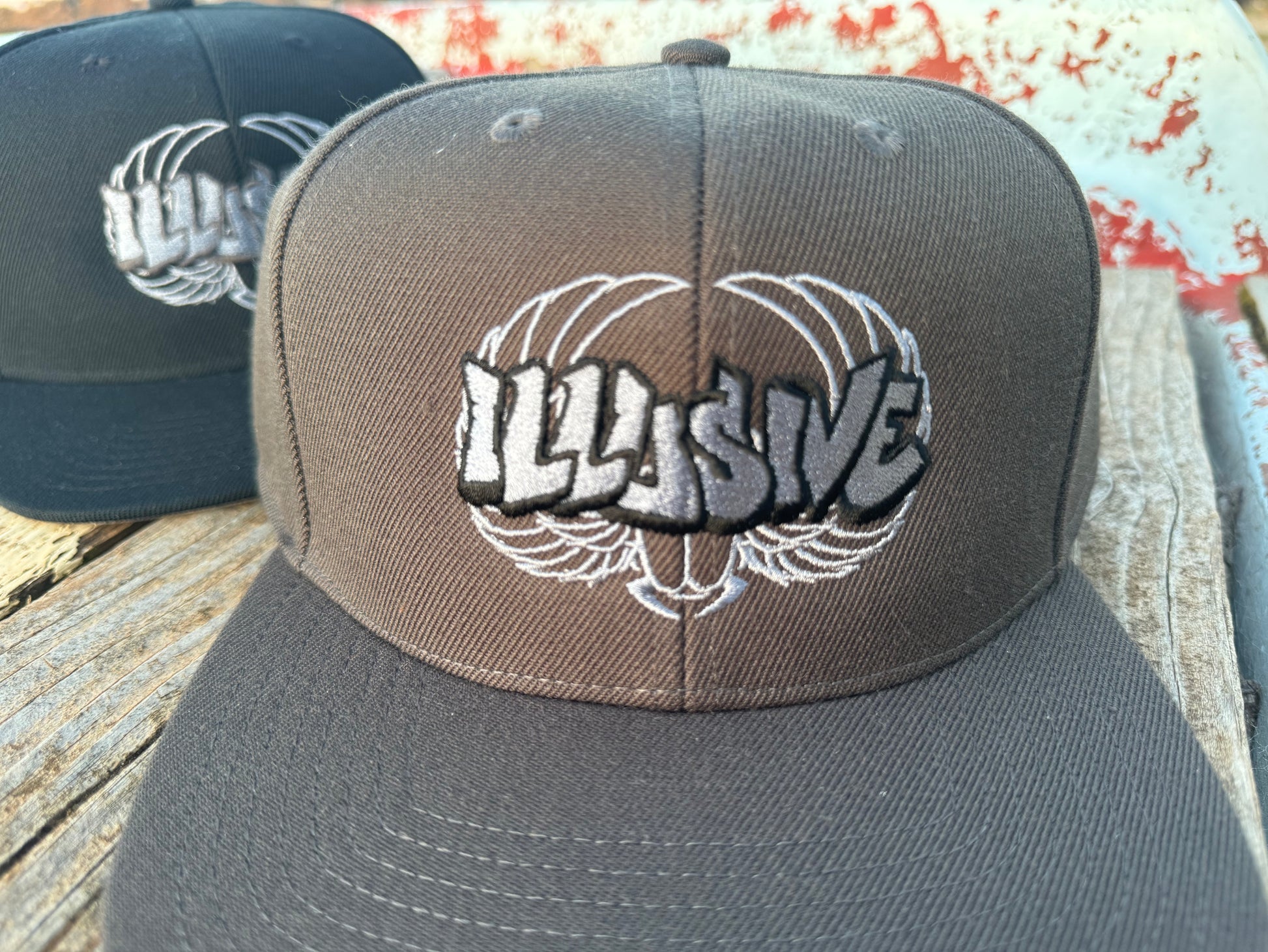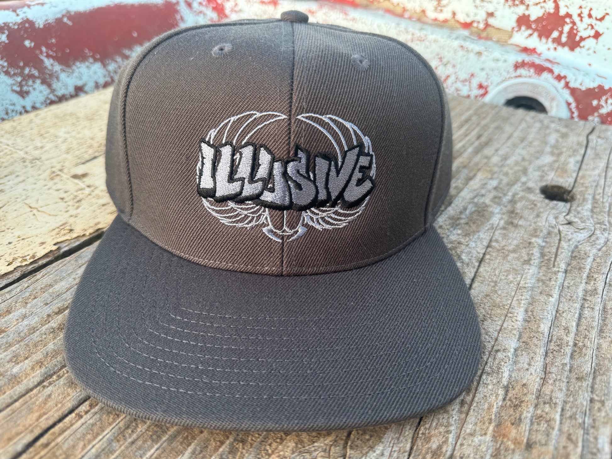 Plastic snapback, light grey under-peak lining, stitching eyelets, self fabric dome at top