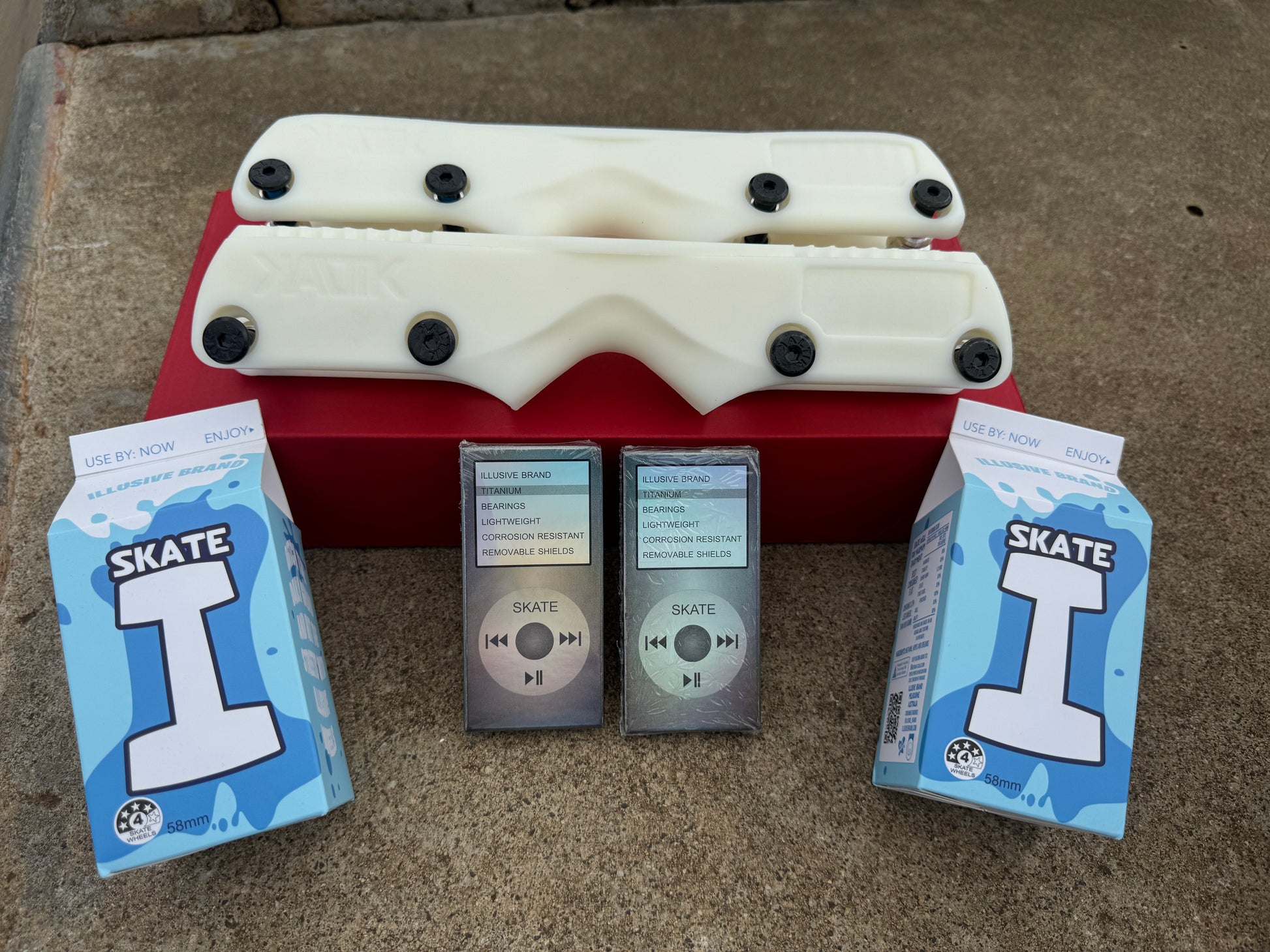 This complete set up includes two Kaltik stealth frames, 8 x 58MM 90a illusive wheels and 16 illusive titanium bearings.