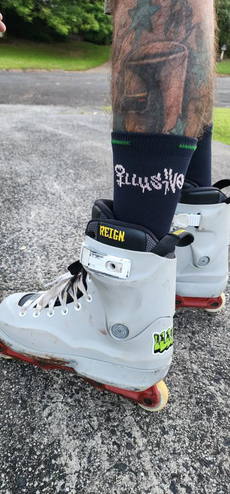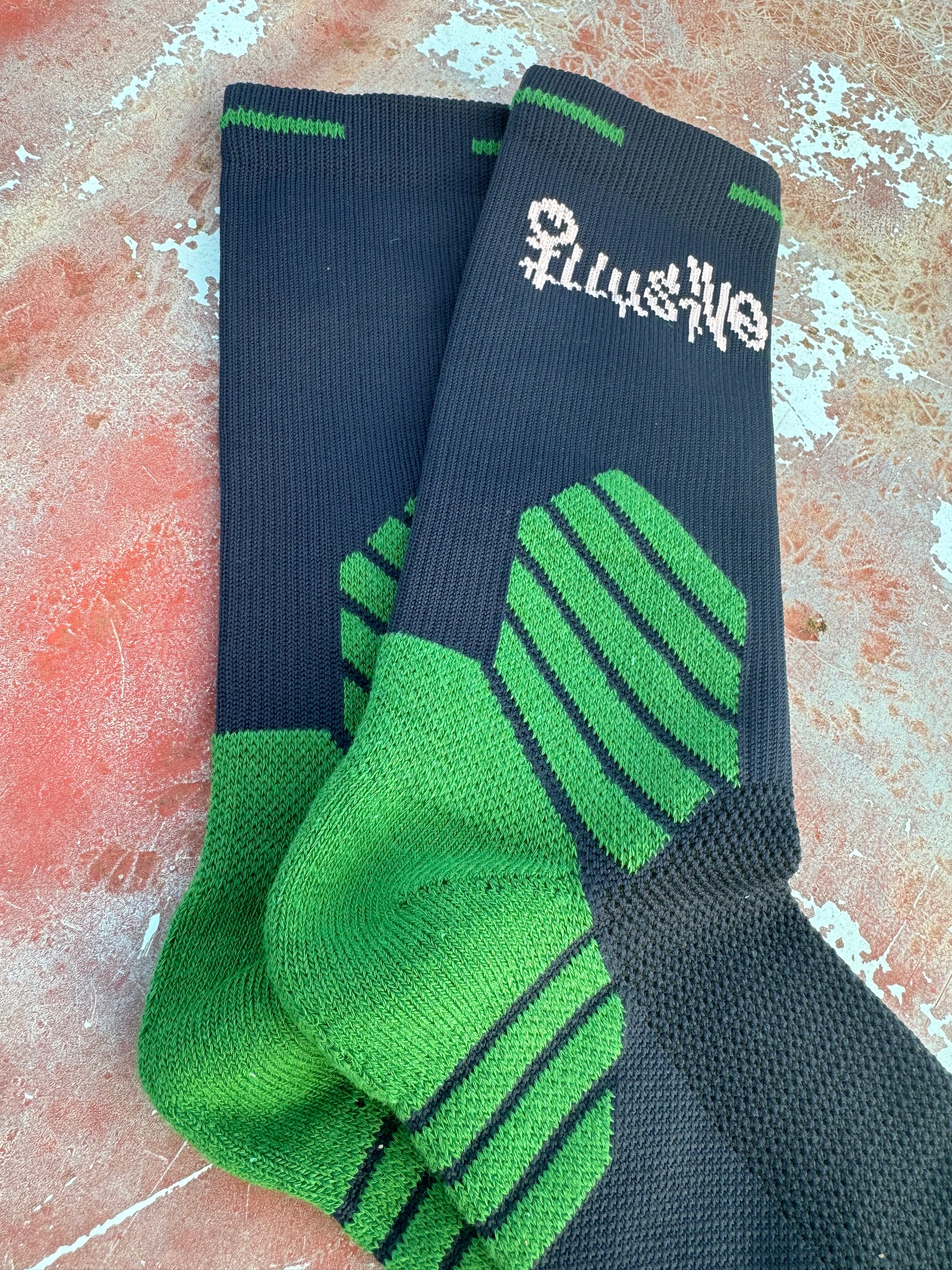 For this run of socks the team chose a nice dark blue with green accents and pink illusive logo.